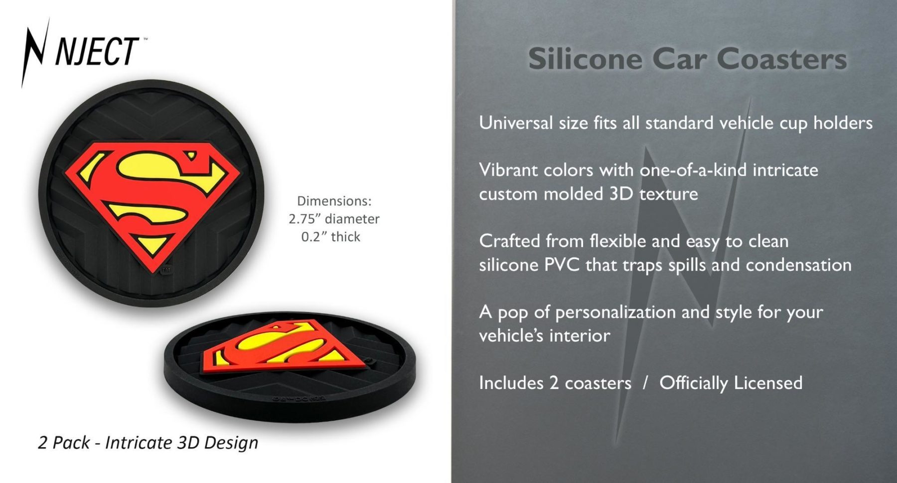 This 2-pack of silicone car coasters features a Superman logo design with intricate custom molded 3D texture and bold color contrast. The raised detailing adds depth, durability, and visual impact while providing a pop of personality and style to your vehicle’s interior. Designed for everyday use, these silicone cup holder coasters combine functional protection with iconic DC Comics flair in a durable automotive accessory.
