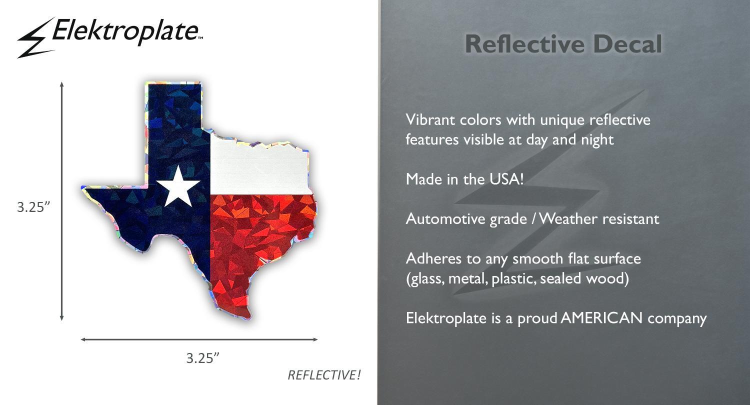 Texas Flag reflective decal (3.25" x 3.25") by Elektroplate. Comprised of UV-protected reflective material, Made in the USA. All Elektroplate reflective decals are extremely visible indoors and outdoors, which makes them perfect for any of the following applications: