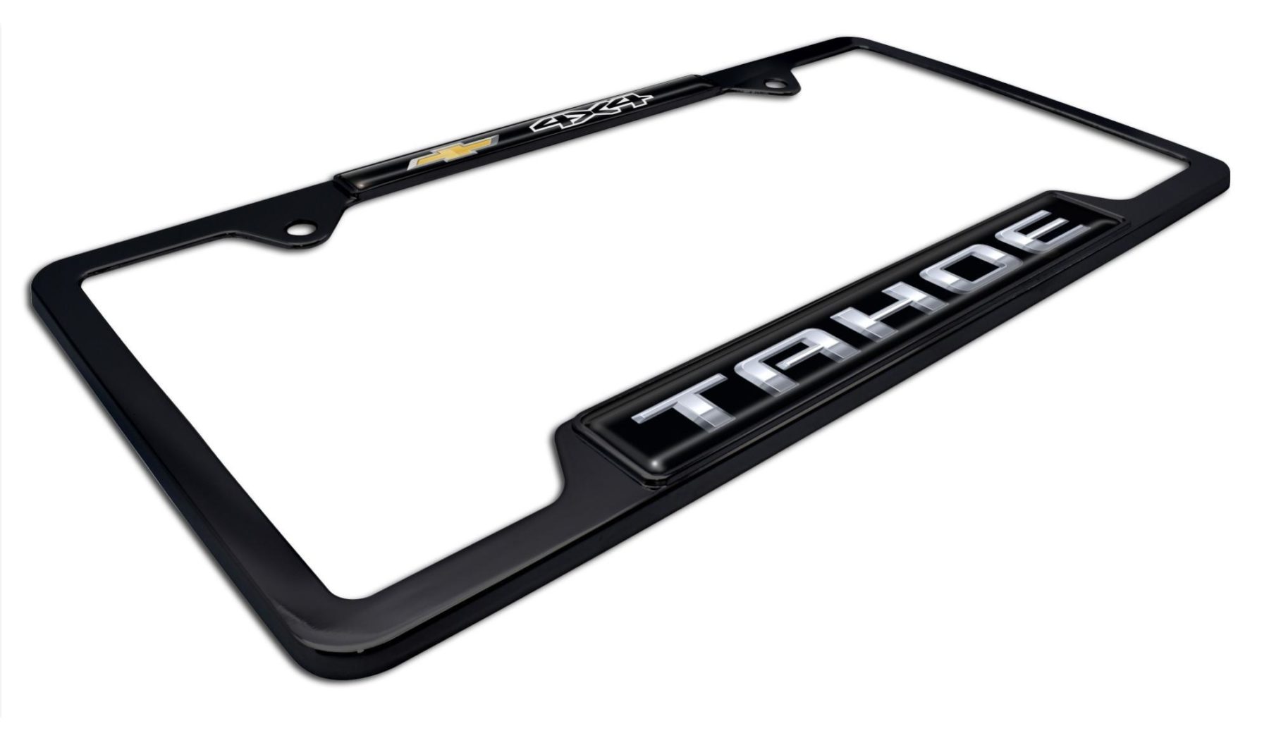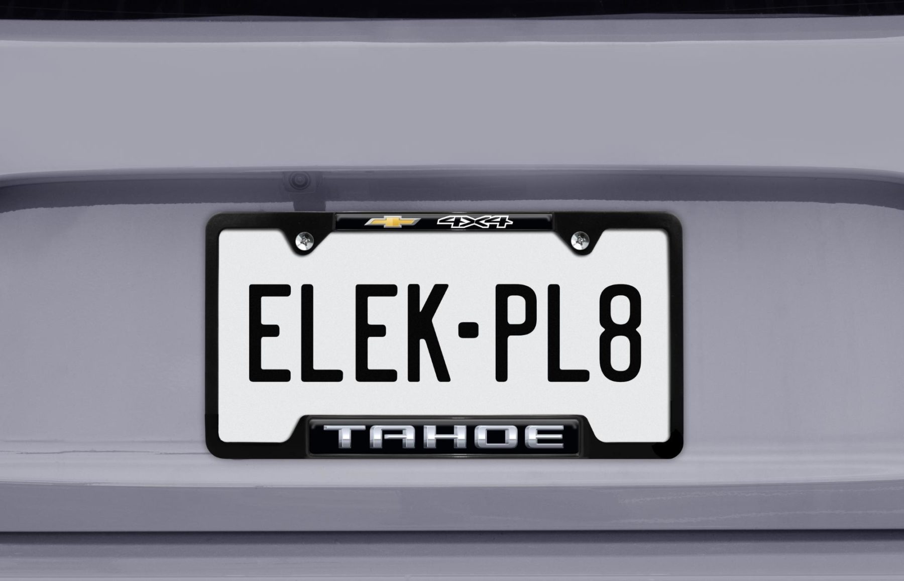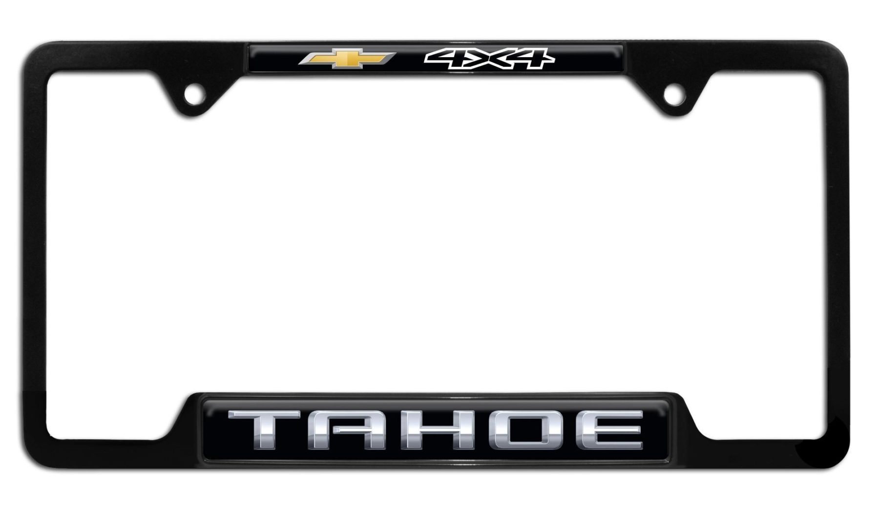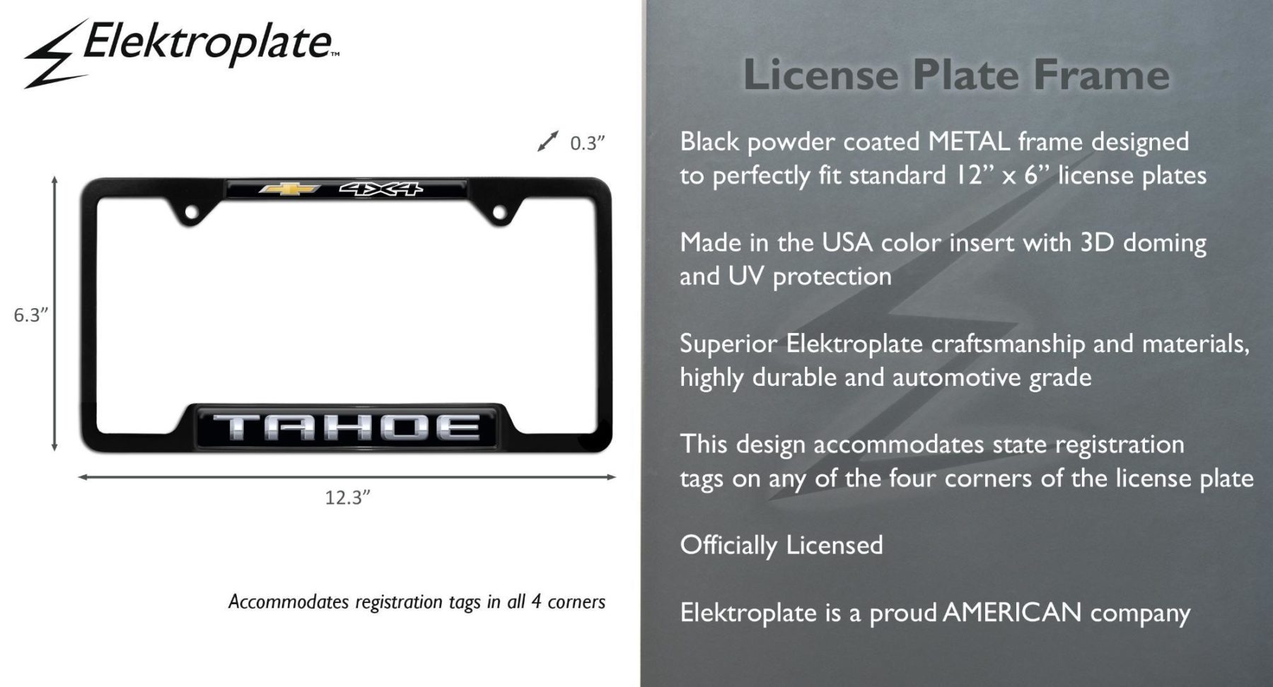 Take your SUV styling to the next level with this officially licensed Tahoe 4x4 license plate frame from Elektroplate. Designed for off-road capable vehicles, this metal frame features black powder coated or chrome plated finishes and fits standard 12 x 6 inch plates. The premium 3D domed insert is made in the USA with UV protection for long-lasting durability and bold visual appeal.