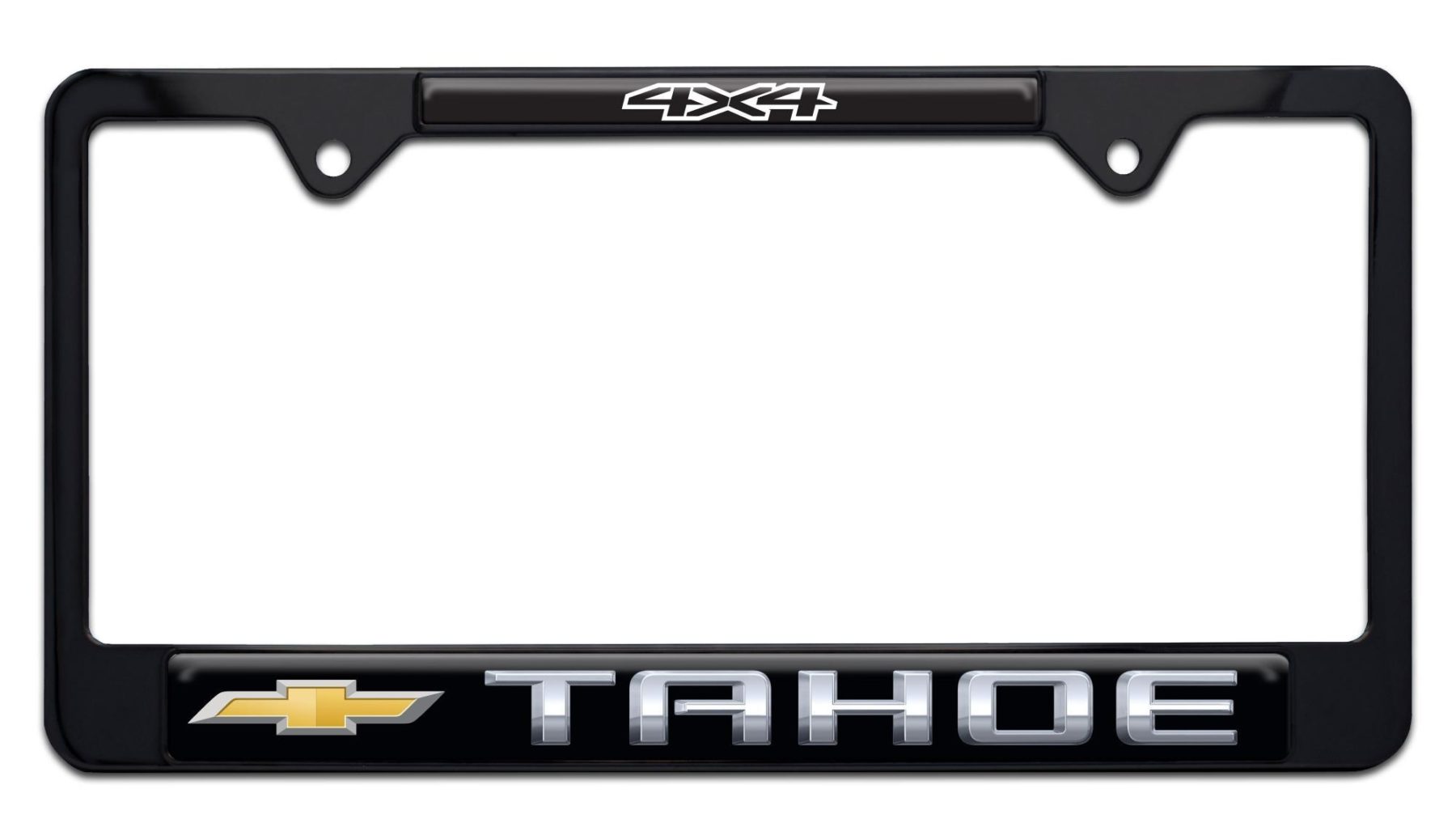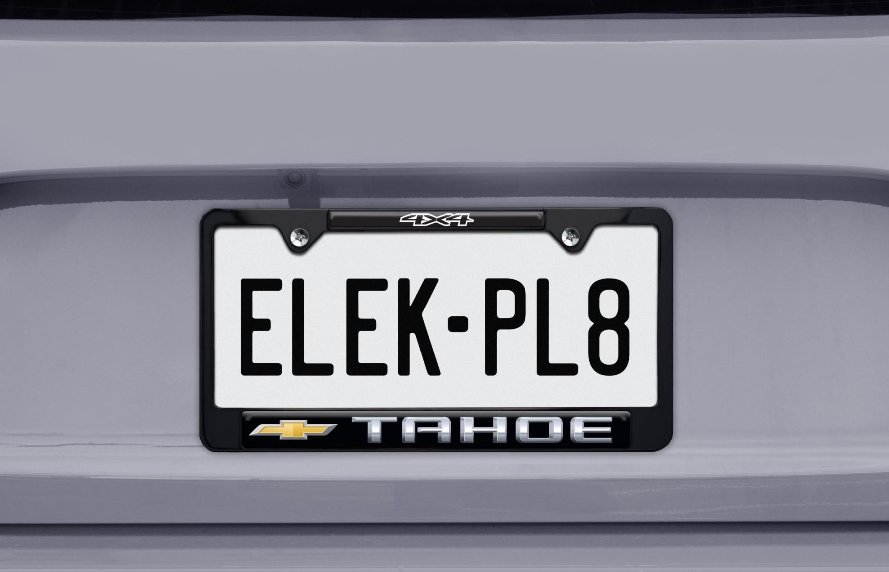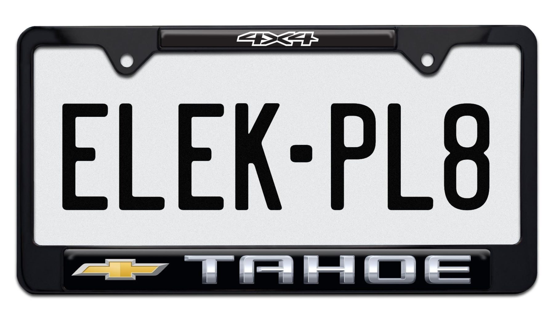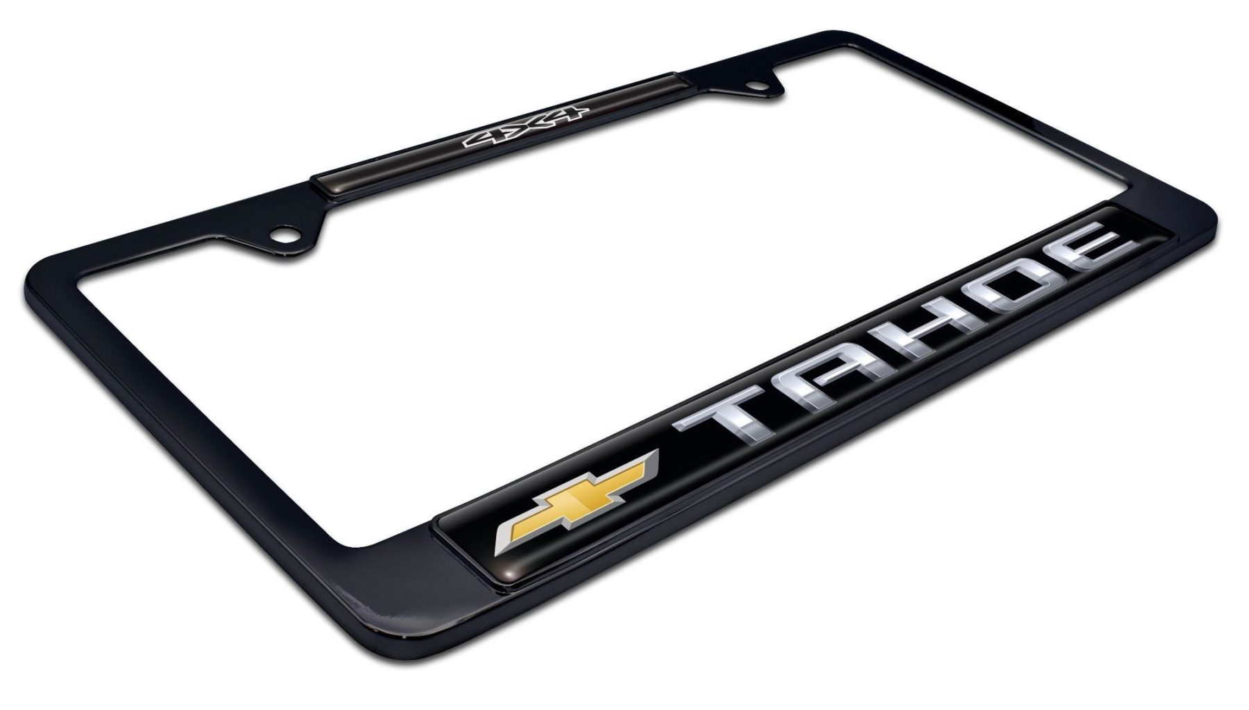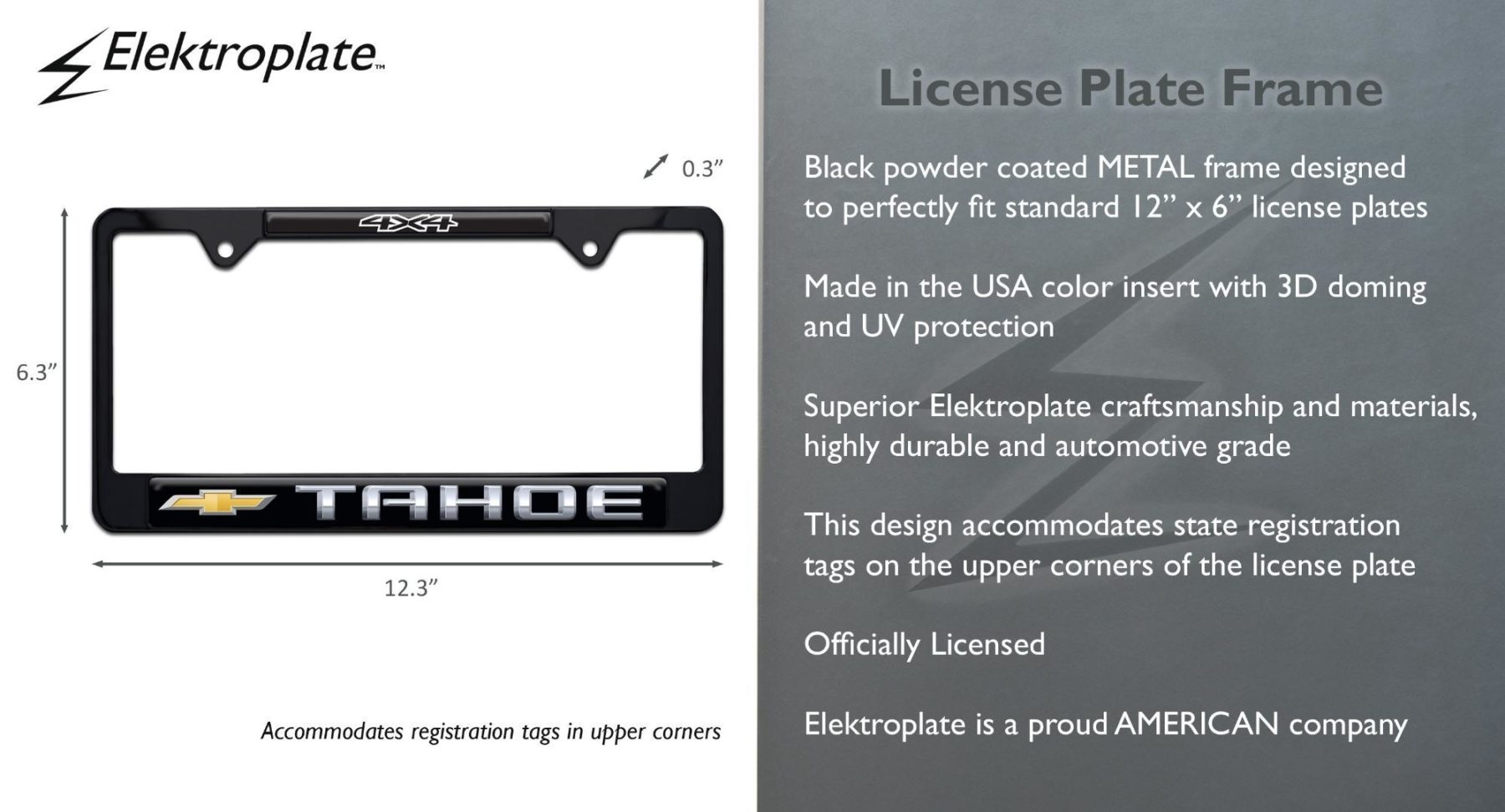 Take your SUV styling to the next level with this officially licensed Tahoe 4x4 license plate frame from Elektroplate. Designed for off-road capable vehicles, this metal frame features black powder coated or chrome plated finishes and fits standard 12 x 6 inch plates. The premium 3D domed insert is made in the USA with UV protection for long-lasting durability and bold visual appeal.