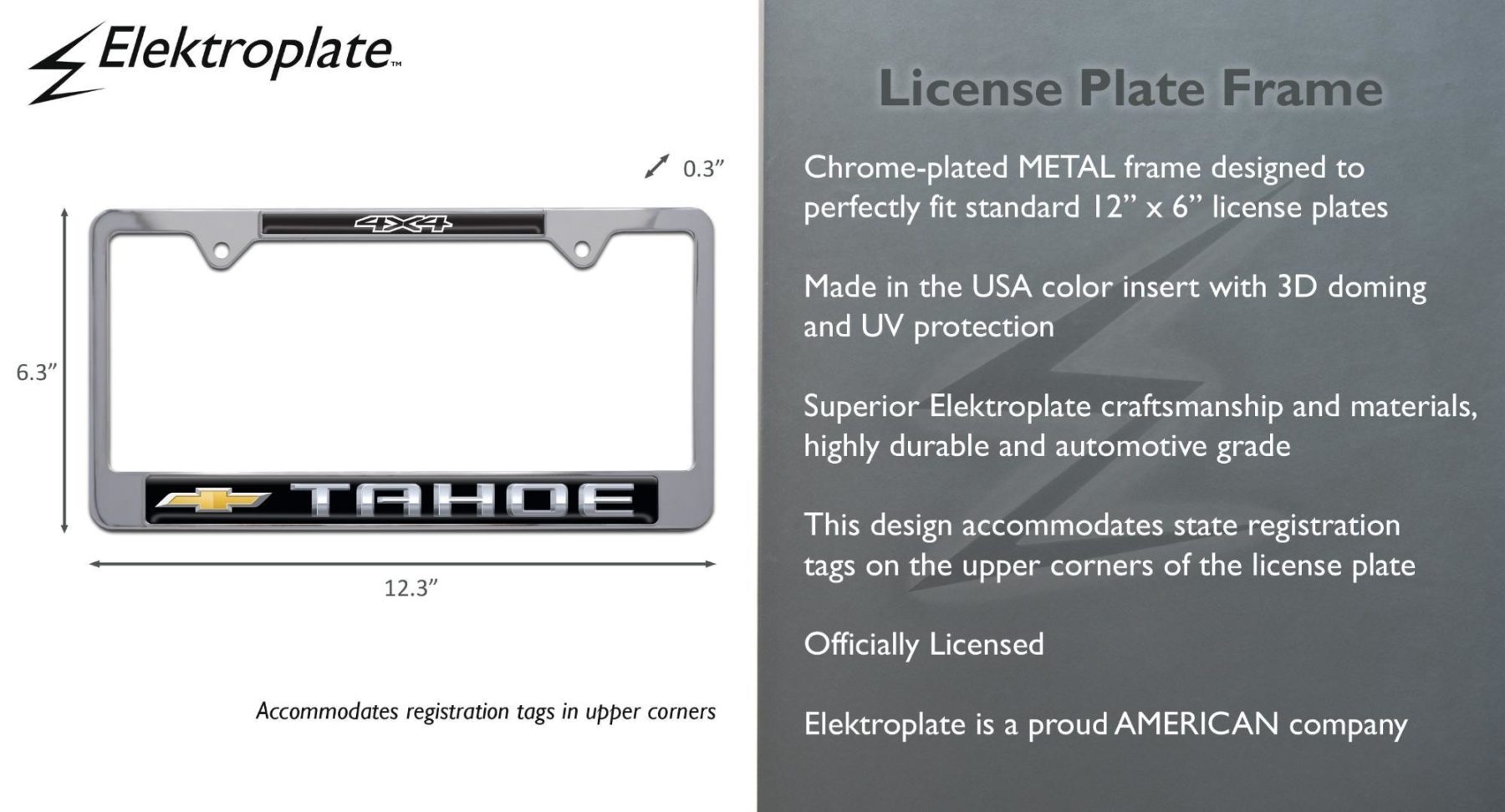 Take your SUV styling to the next level with this officially licensed Tahoe 4x4 license plate frame from Elektroplate. Designed for off-road capable vehicles, this metal frame features black powder coated or chrome plated finishes and fits standard 12 x 6 inch plates. The premium 3D domed insert is made in the USA with UV protection for long-lasting durability and bold visual appeal.