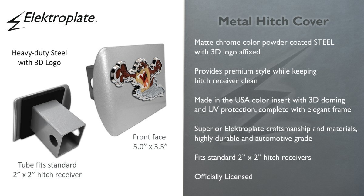 Show your Looney Tunes Comics pride with this officially licensed Taz all-metal hitch cover from Elektroplate. Featuring a striking chrome-plated metal Taz emblem securely mounted on a durable matte chrome powder coated all-metal hitch plate, this accessory delivers both style and strength. The front plate measures 5” x 3.5” and fits standard 2” trailer hitch receivers. If it doesn’t fit perfectly, you may return it for a full refund.