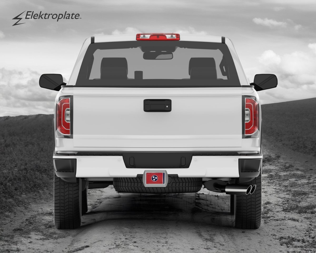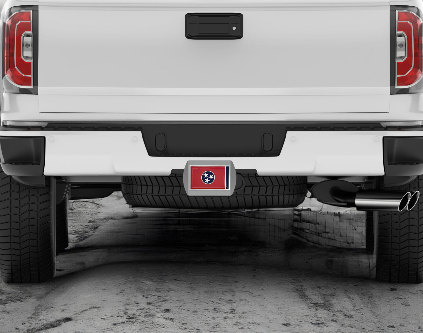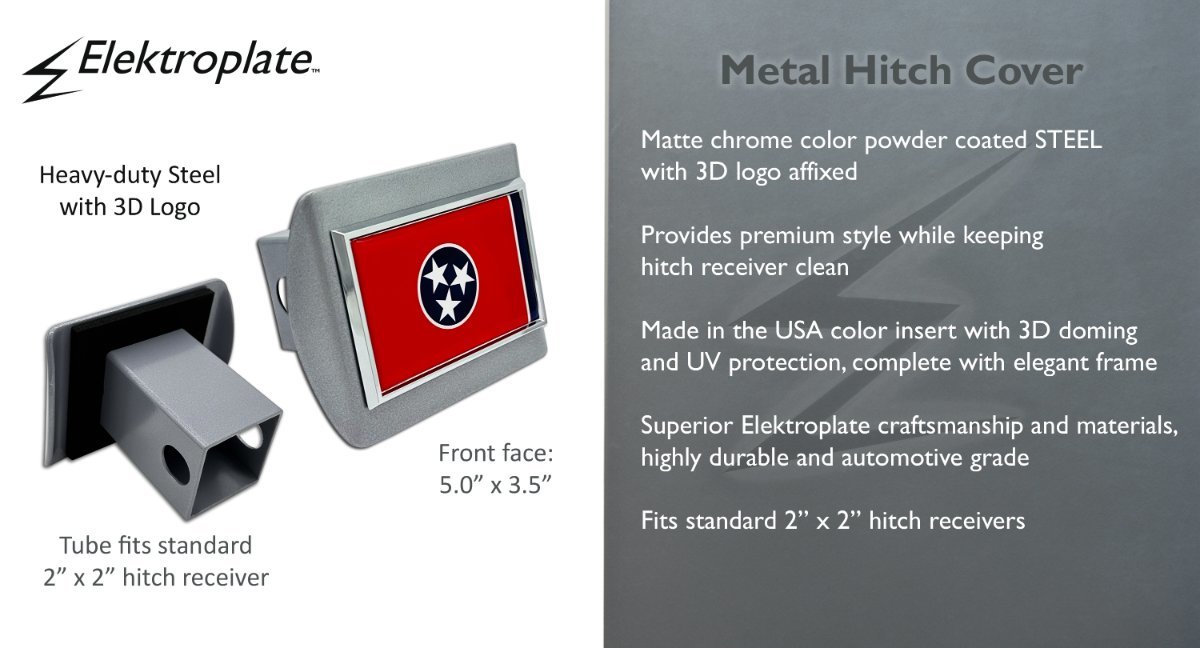 Tennessee Flag ALL-METAL hitch cover (front plate measures 5” x 3.5”) by Elektroplate offers superior quality and appearance compared to cheaper plastic and pewter versions. It features an OEM ABS plastic core with a chrome-plated metal finish Tennessee Flag emblem securely adhered to a brushed chrome all-metal hitch cover mount. Designed to fit standard 2” trailer hitch receivers—if it doesn’t fit perfectly, you may return it for a full refund.