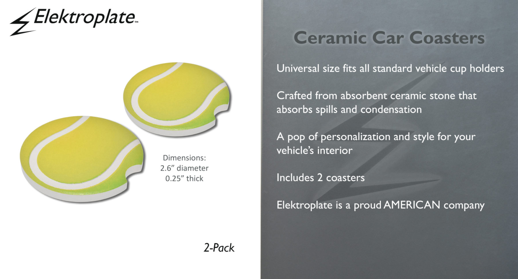 Keep your ride clean and stylish with Elektroplate's Tennis Ball Car Coasters (Set of 2). These 2.6" diameter coasters are designed to fit all standard cup holders and absorb spills and condensation while maintaining their vivid colors. Crafted with care, these high-quality car coasters not only protect your car, but also add a touch of personality to your space. Easy to clean and durable enough for everyday use, they’re the ideal accessory to showcase your style on the go.