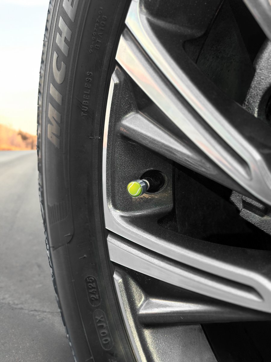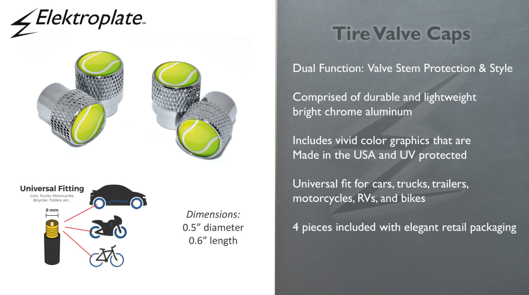 Tennis Ball 4-Piece Bright Chrome Universal Valve Stem Caps by Elektroplate. Crafted with UV-protected, scratch-resistant domed graphics made in the USA, these premium valve caps deliver durability with a brilliant bright chrome finish. Each cap is made from lightweight, corrosion-resistant aluminum and includes a high-quality leakproof sealing ring to help prevent pressure loss.