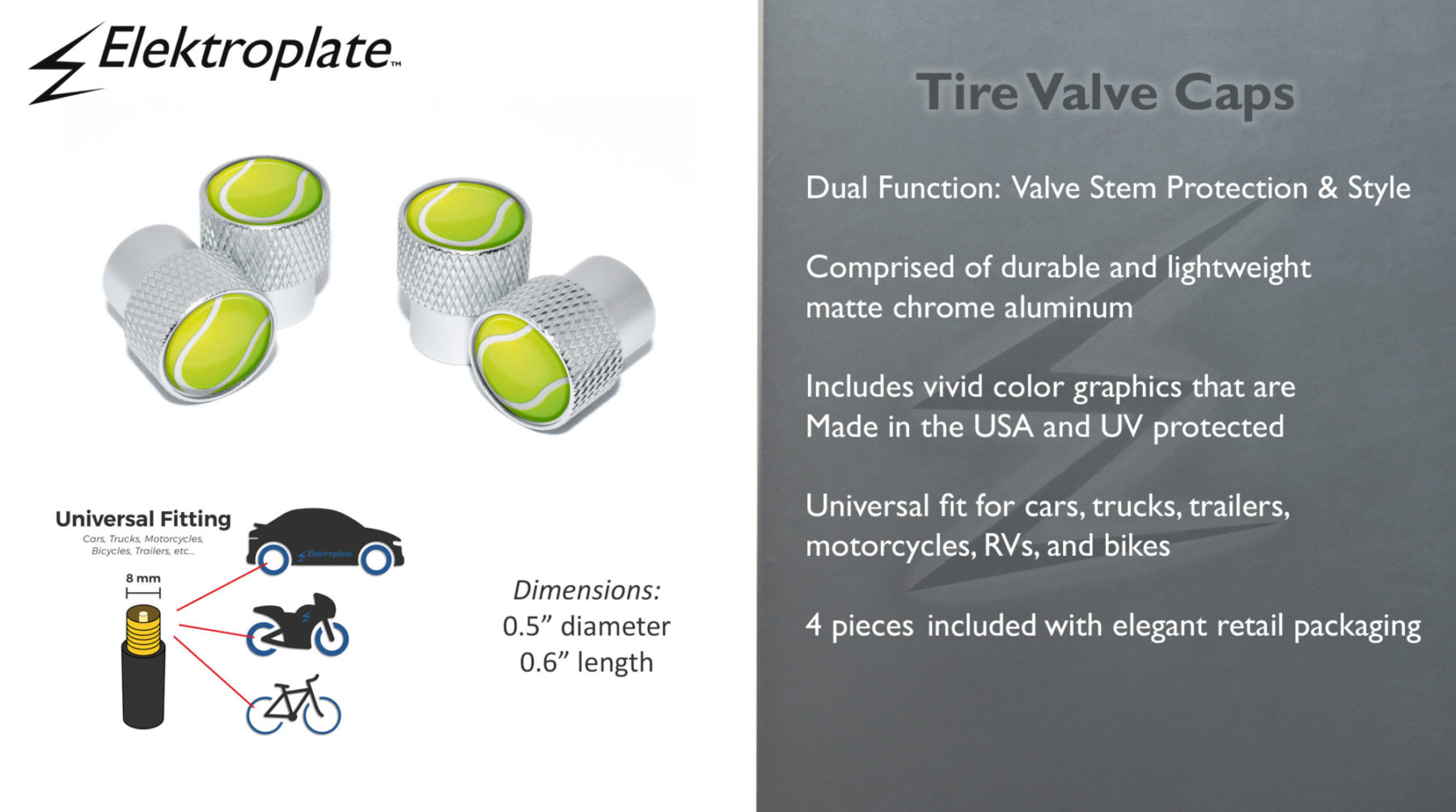 Tennis 4-Piece Matte Chrome Universal Valve Stem Caps by Elektroplate. Designed with UV-protected, scratch-resistant domed graphics made in the USA, these premium valve caps combine durability with a sleek matte chrome finish. Each cap is constructed from lightweight, corrosion-resistant aluminum and includes a high-quality leakproof sealing ring to help prevent pressure loss.