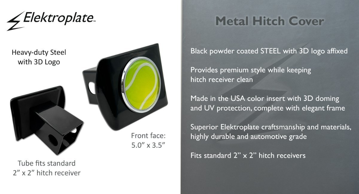 Tennis ALL-METAL hitch cover (front plate is 5” x 3.5”) by Elektroplate — a step above in quality and appearance compared to cheaper plastic and pewter versions. Features an all-metal tennis emblem securely mounted on a black all-metal hitch cover. Fits standard 2” trailer hitch receivers (if it doesn’t fit perfectly, you may return it for a full refund).