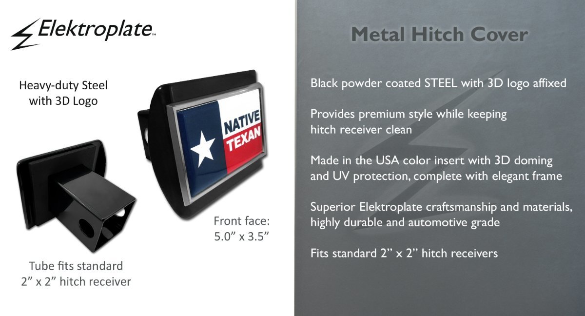 Show off your Texas roots with the Texas Native Flag ALL-METAL hitch cover by Elektroplate. Featuring a chrome-plated Texas emblem mounted on a sleek black all-metal hitch plate measuring 5” x 3.5”, this premium accessory offers standout style and superior durability. Designed to fit all standard 2” trailer hitch receivers—and if it doesn’t fit perfectly, you may return it for a full refund.