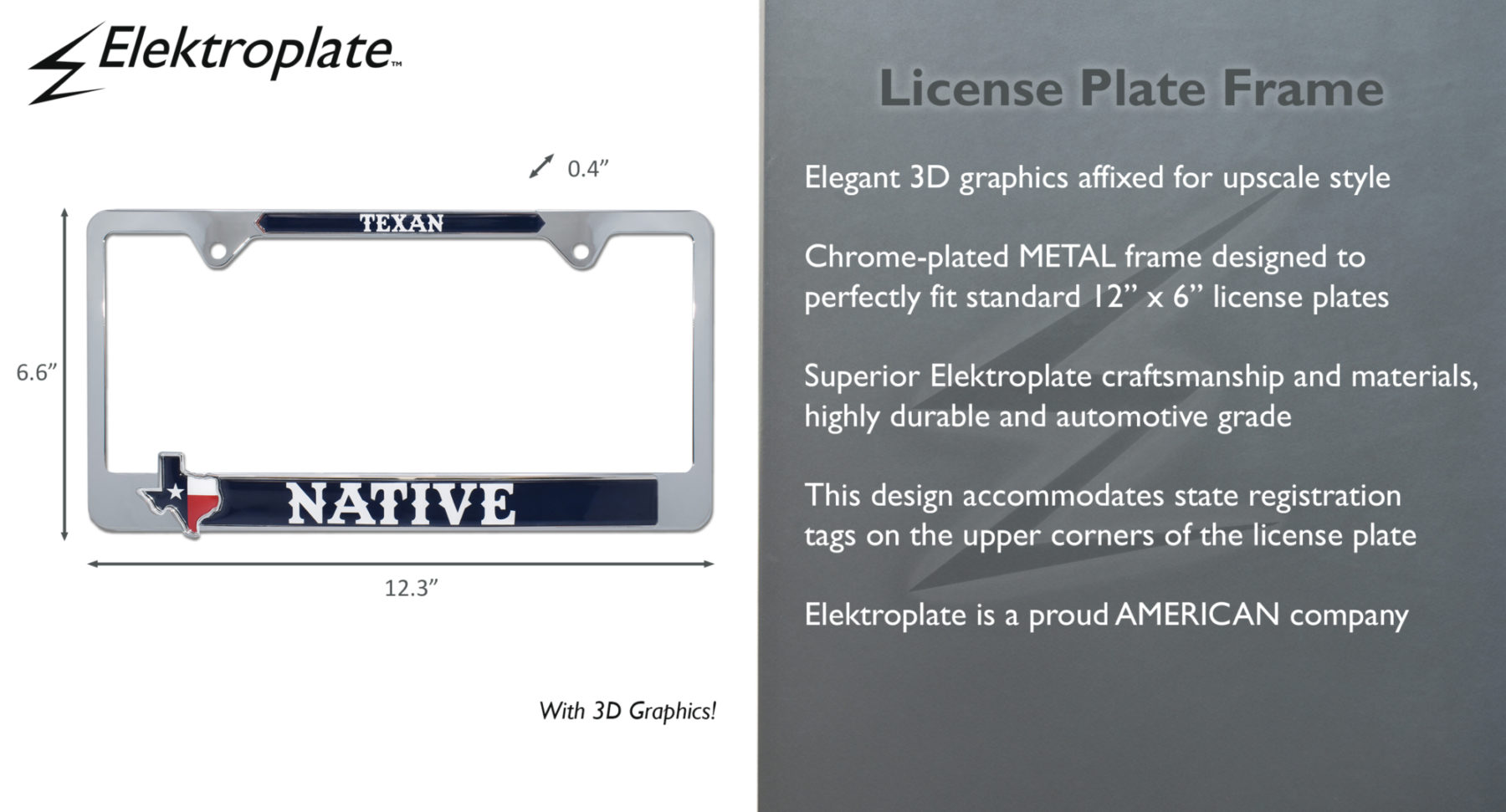 Elevate your vehicle’s style with this Texas Flag chrome-plated metal license plate frame (12.3" x 6.6") by Elektroplate. This high-quality all-metal frame is comprised of striking custom molded 3D features and is built to endure the elements, ensuring it remains looking brand new for years without chipping or fading. Our high-end license plate frames are the perfect way to showcase your Texan pride everywhere you drive.
