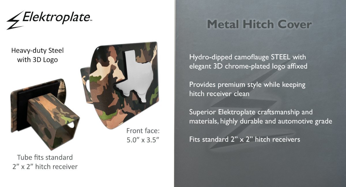 Love the great outdoors? Bring that rugged spirit with you everywhere you go with this Woodlands Camo Texas all-metal hitch cover by Elektroplate. Featuring a bold all-metal Texas emblem mounted on a camouflage-patterned all-metal hitch plate measuring 5” x 3.5”, this unique accessory adds personality and outdoor flair to your vehicle. Fits standard 2” trailer hitch receivers—if it doesn’t fit perfectly, you may return it for a full refund.