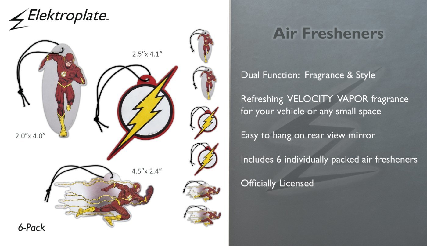 Bring high-speed freshness to every drive with the Elektroplate DC Comics The Flash Air Freshener 6-Pack in Velocity Vapor. Featuring officially licensed designs of The Flash in action along with his iconic lightning bolt logo, this set delivers bold superhero style paired with a smooth, refreshing scent. Velocity Vapor blends notes of musk, sandalwood, and amber to create a clean, modern fragrance that helps eliminate odors while elevating your driving experience.