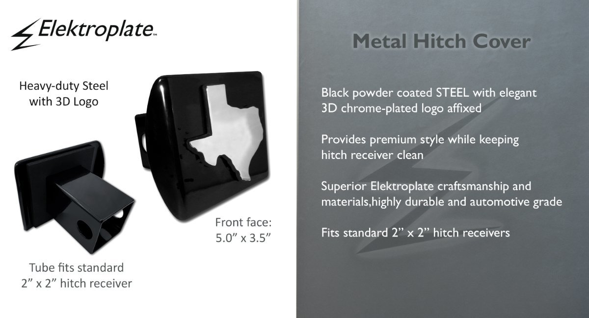 Show off your Lone Star State pride with this Texas Shape ALL-METAL hitch cover by Elektroplate. Featuring a bold Texas emblem mounted on a sleek black all-metal hitch plate measuring 5” x 3.5”, this accessory delivers standout style and rugged durability. Designed to fit all standard 2” trailer hitch receivers—and if it doesn’t fit perfectly, you may return it for a full refund.