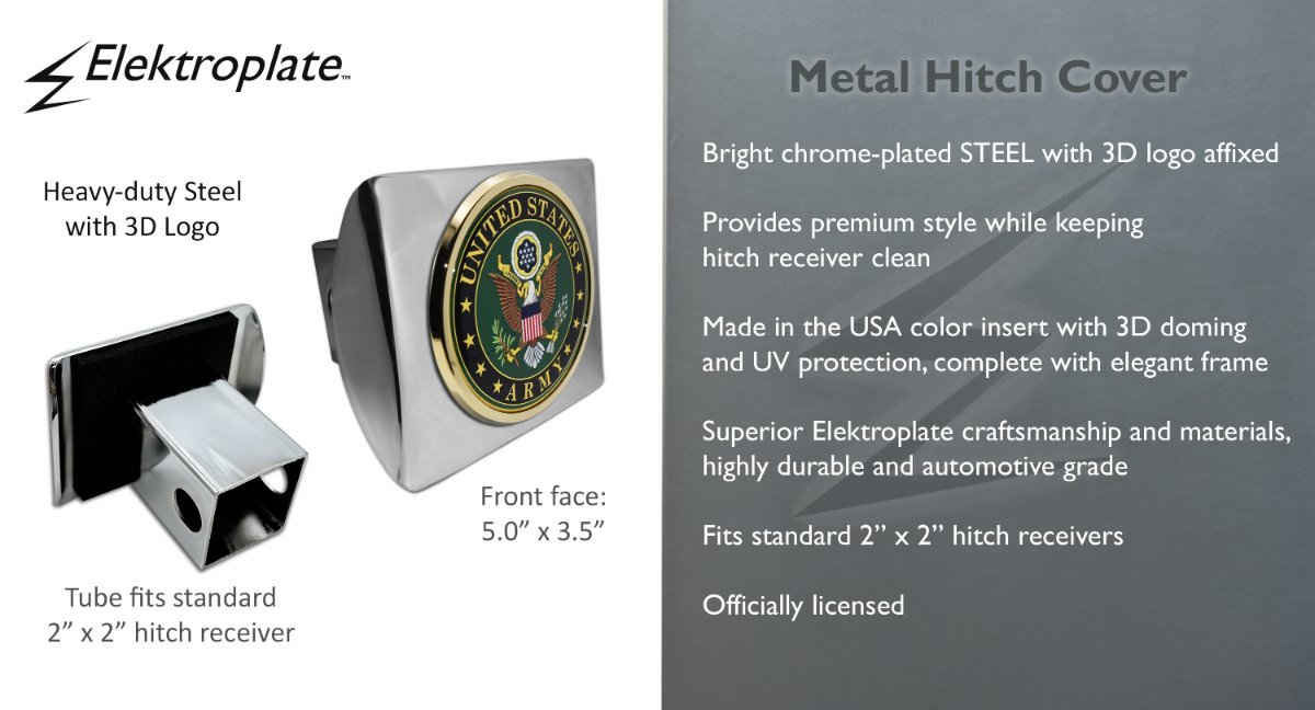 Proudly display your support with this officially licensed U.S. Army all-metal hitch cover by Elektroplate. The front plate measures 5” x 3.5” and features a robust all-metal U.S. Army emblem mounted on a sleek chrome all-metal hitch cover base. Designed to fit standard 2” trailer hitch receivers—backed by a full refund guarantee if it doesn’t fit perfectly—this hitch cover is a superior choice over plastic, pewter, tin, or aluminum alternatives.