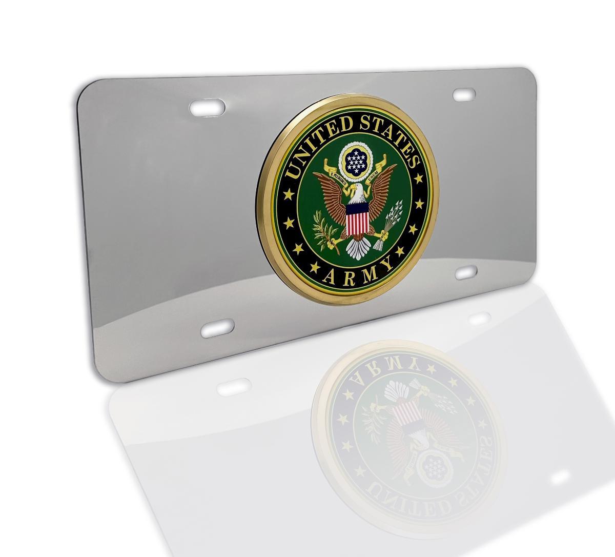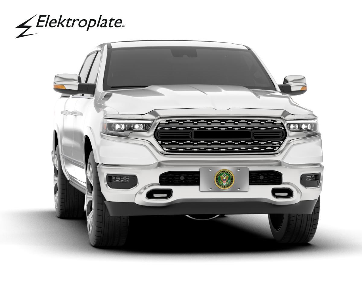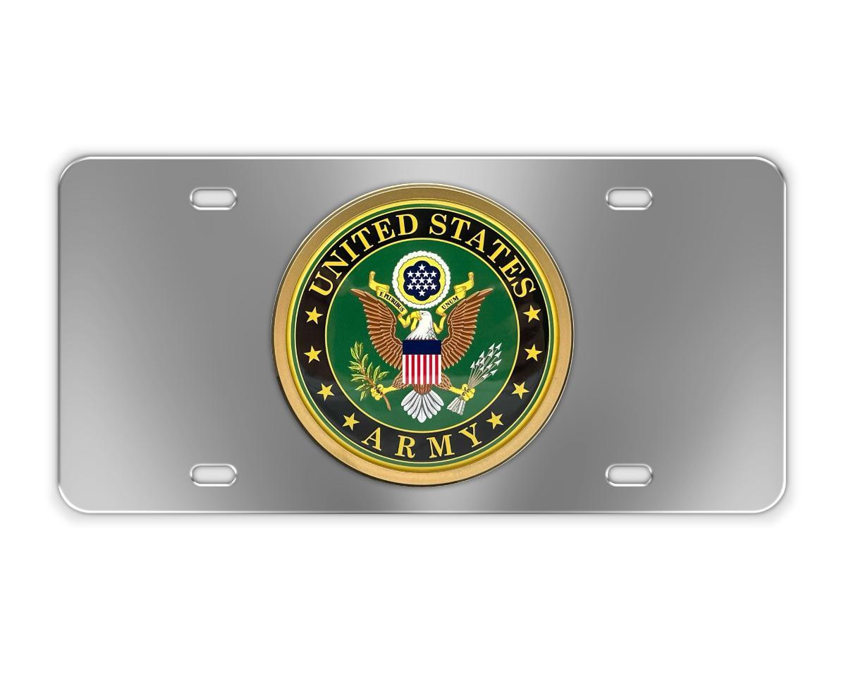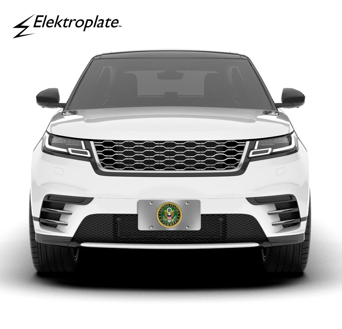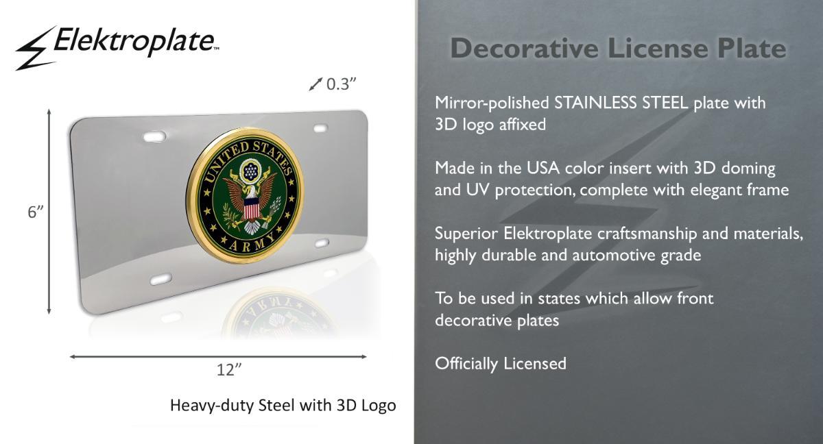 Officially licensed – U.S. Army ALL METAL front license plate (12” x 6”) by Elektroplate. Comprised of an over-sized UV protected decal with 3D doming features (Made in the USA) and an OEM frame adhered to a stainless steel all-metal license plate base.