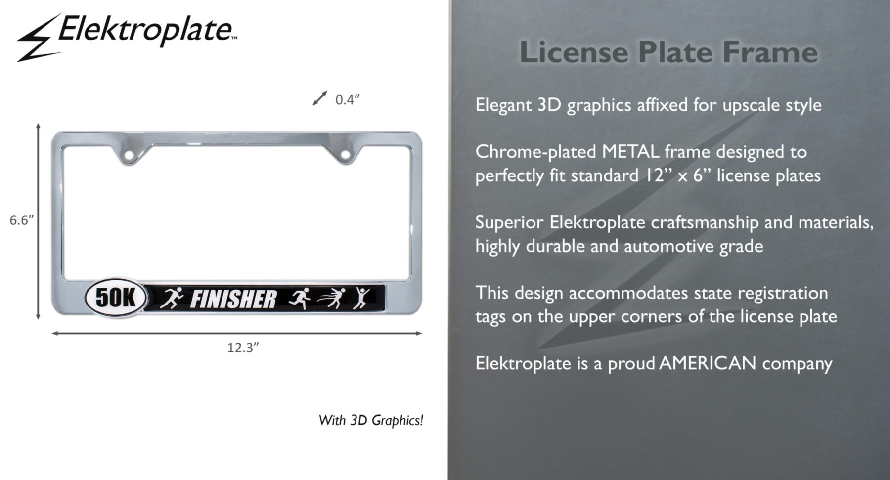 50K Ultra Marathon shiny chrome license plate frame (12.3" x 6.6") by Elektroplate. All-metal (NOT plastic) frame with a shiny chrome finish, and full color UV-protected domed inserts.
