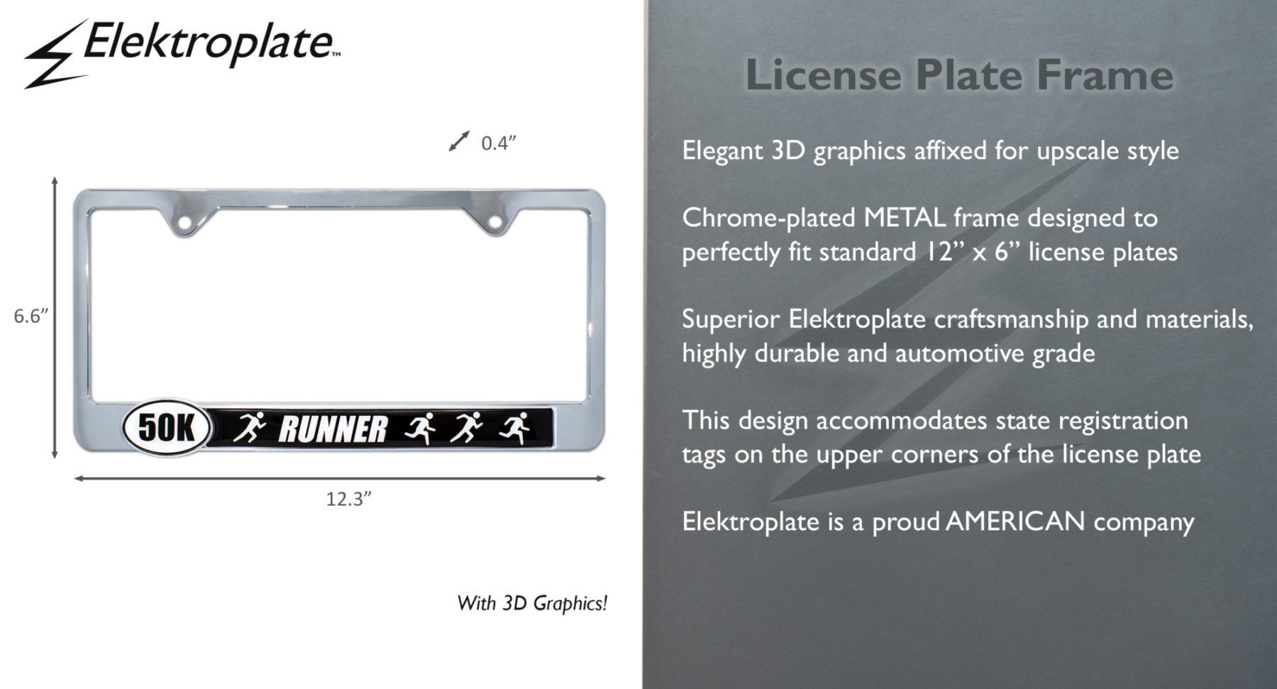 50K Ultra Marathon shiny chrome license plate frame (12.3" x 6.6") by Elektroplate. All-metal (NOT plastic) frame with a shiny chrome finish, and full color UV-protected domed inserts.