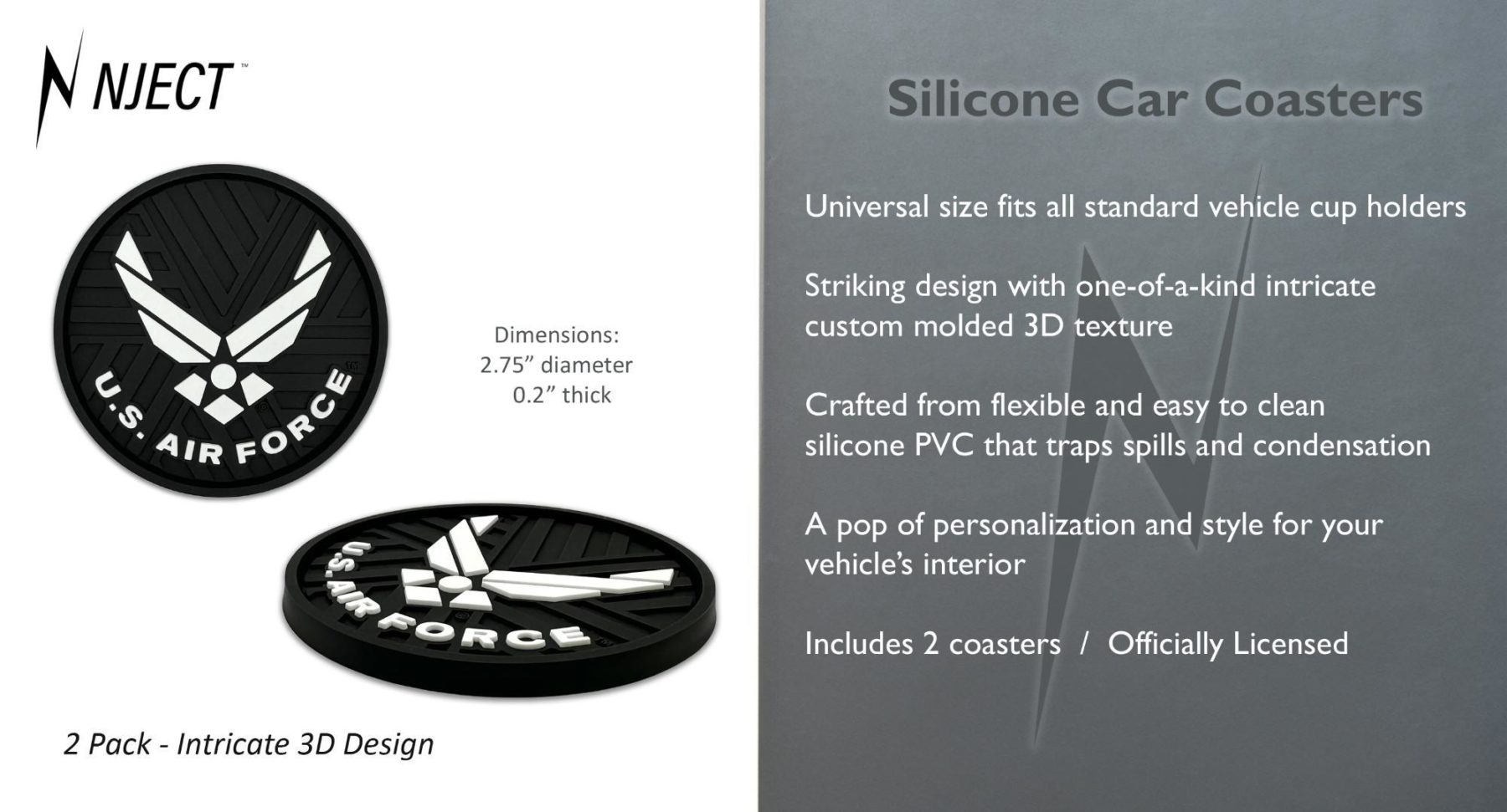 This 2-pack of silicone car coasters features the Air Force Wings design with intricate custom molded 3D texture and bold color contrast. The raised detailing adds depth, durability, and visual impact while providing a pop of personality and style to your vehicle’s interior. Designed for everyday use, these silicone cup holder coasters combine functional protection with iconic patriotic flair in a durable automotive accessory.