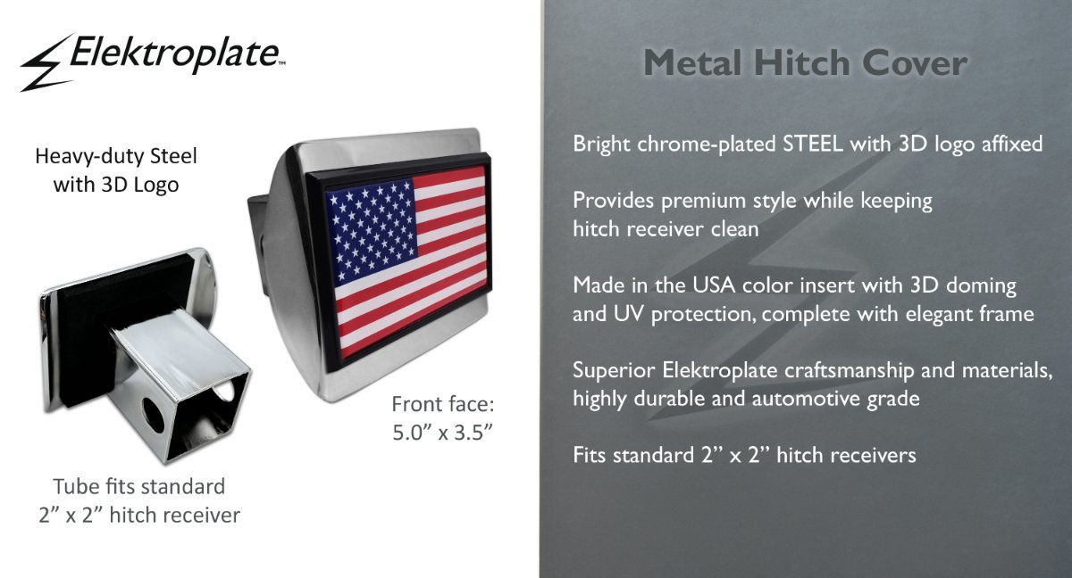 American Flag ALL-METAL Hitch Cover (front plate: 5” x 3.5”) by Elektroplate — a premium upgrade in quality and appearance over cheaper plastic and pewter versions. Features an OEM-style USA emblem (ABS plastic core with a black metal finish) securely mounted on a shiny chrome all-metal hitch cover base. Fits standard 2” trailer hitch receivers. If it doesn’t fit perfectly, you may return it for a full refund.