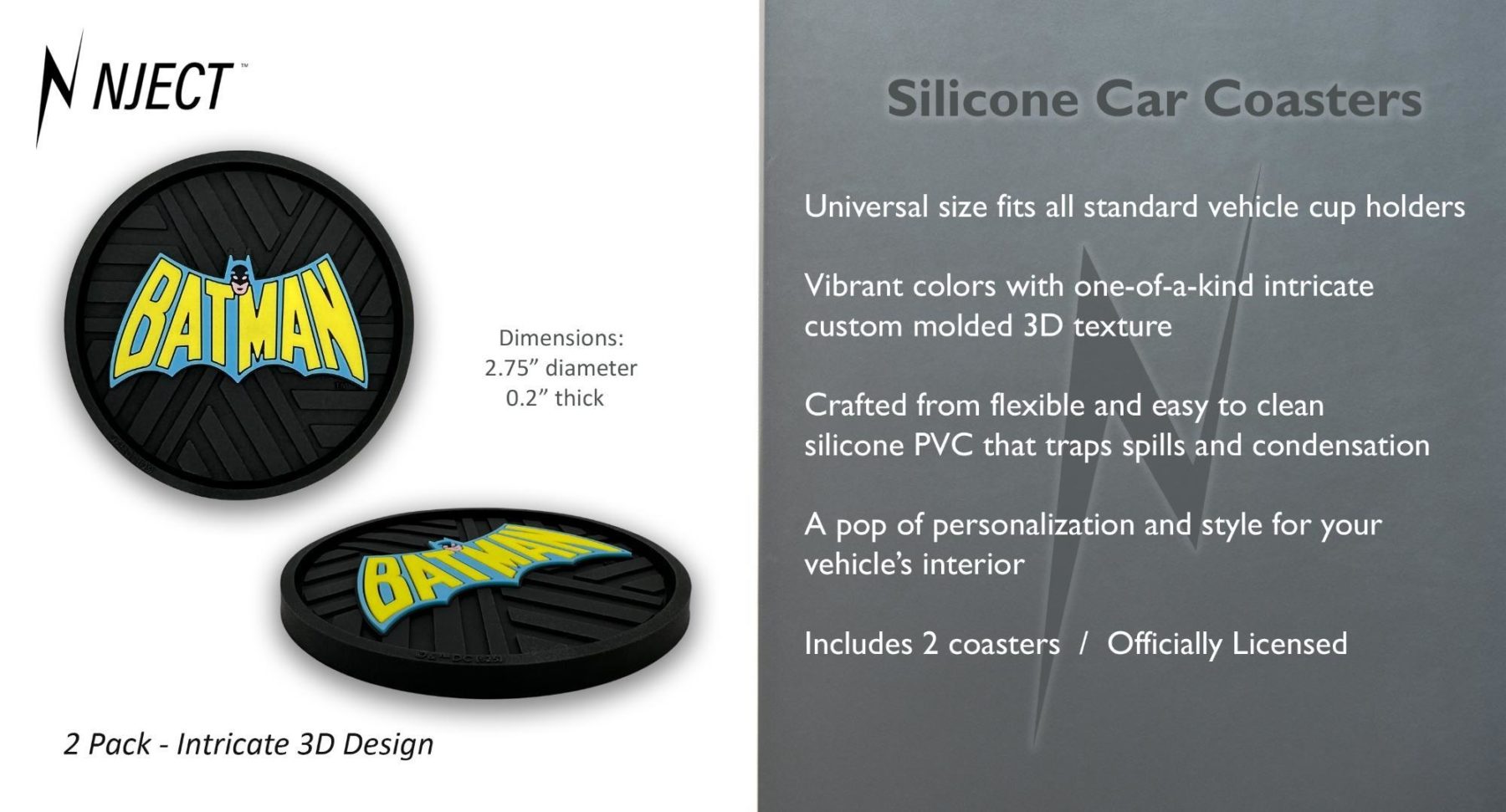 This 2-pack of silicone car coasters features vibrant colors and intricate custom molded 3D texture showcasing a classic vintage Batman logo design. The raised detailing adds depth, durability, and visual character while delivering a bold pop of personalization to your vehicle’s interior. Designed for daily driving, these silicone cup holder coasters combine functional protection with retro Batman style in a durable automotive accessory.