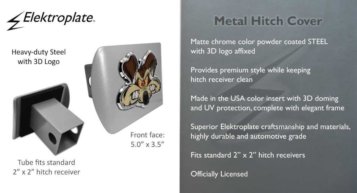 Celebrate your Looney Tunes fandom with this officially licensed Wile E. Coyote all-metal hitch cover from Elektroplate. Featuring a detailed, chrome-plated metal emblem of Wile E. Coyote mounted on a brushed black all-metal hitch plate, this accessory combines iconic style with durable construction. The front plate measures 5” x 3.5” and fits standard 2” trailer hitch receivers. If it doesn’t fit perfectly, you may return it for a full refund.