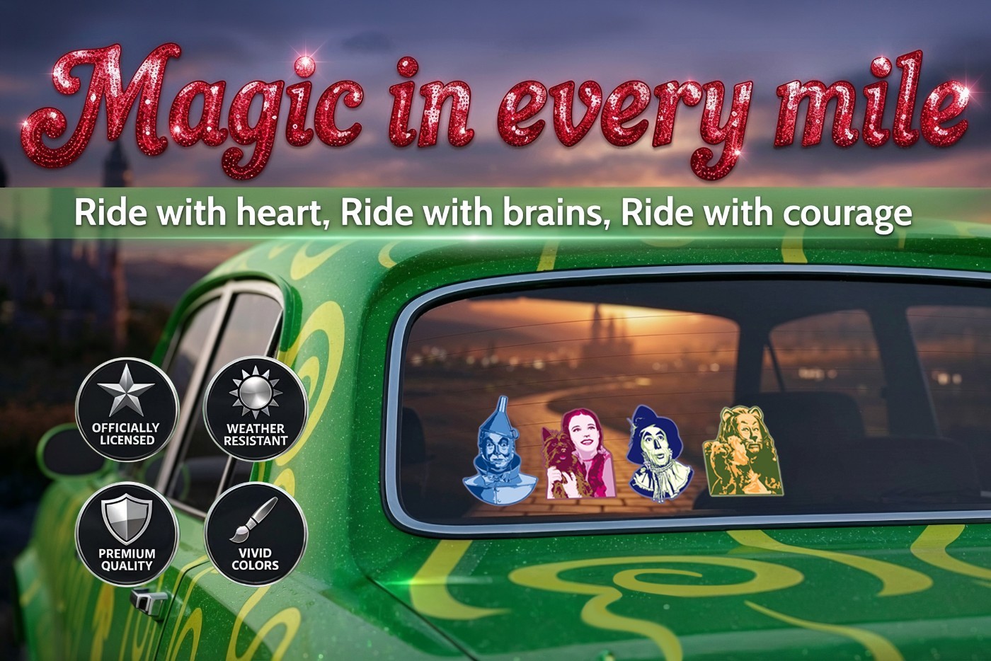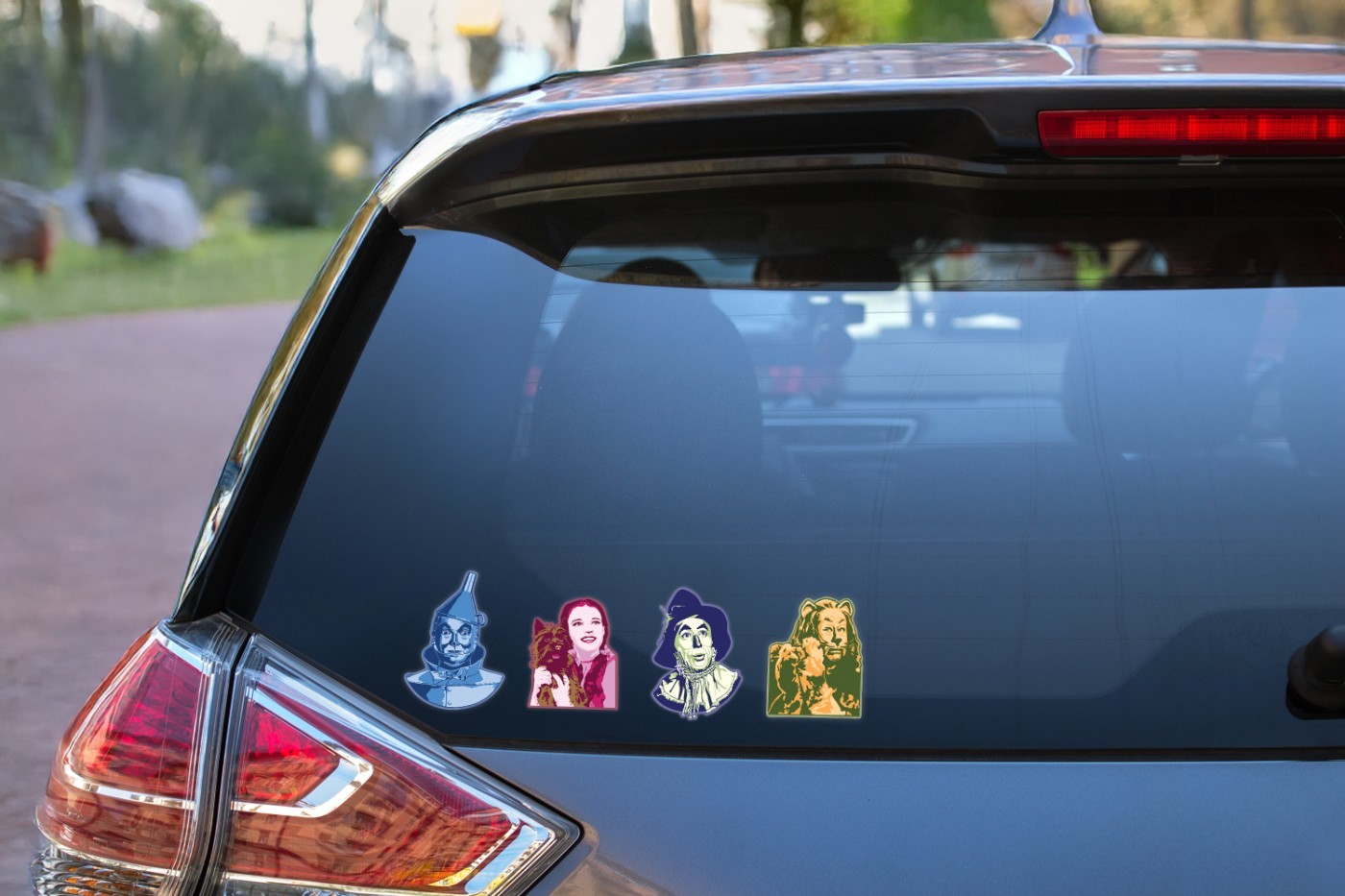 We're off to see the Wizard! Drive to the Emerald City with this Officially Licensed Wizard of Oz decal 4-pack. Proudly made in the USA, our decals are automotive grade, UV-protected, weather resistant full-color graphic stickers designed to last even in outdoor conditions.