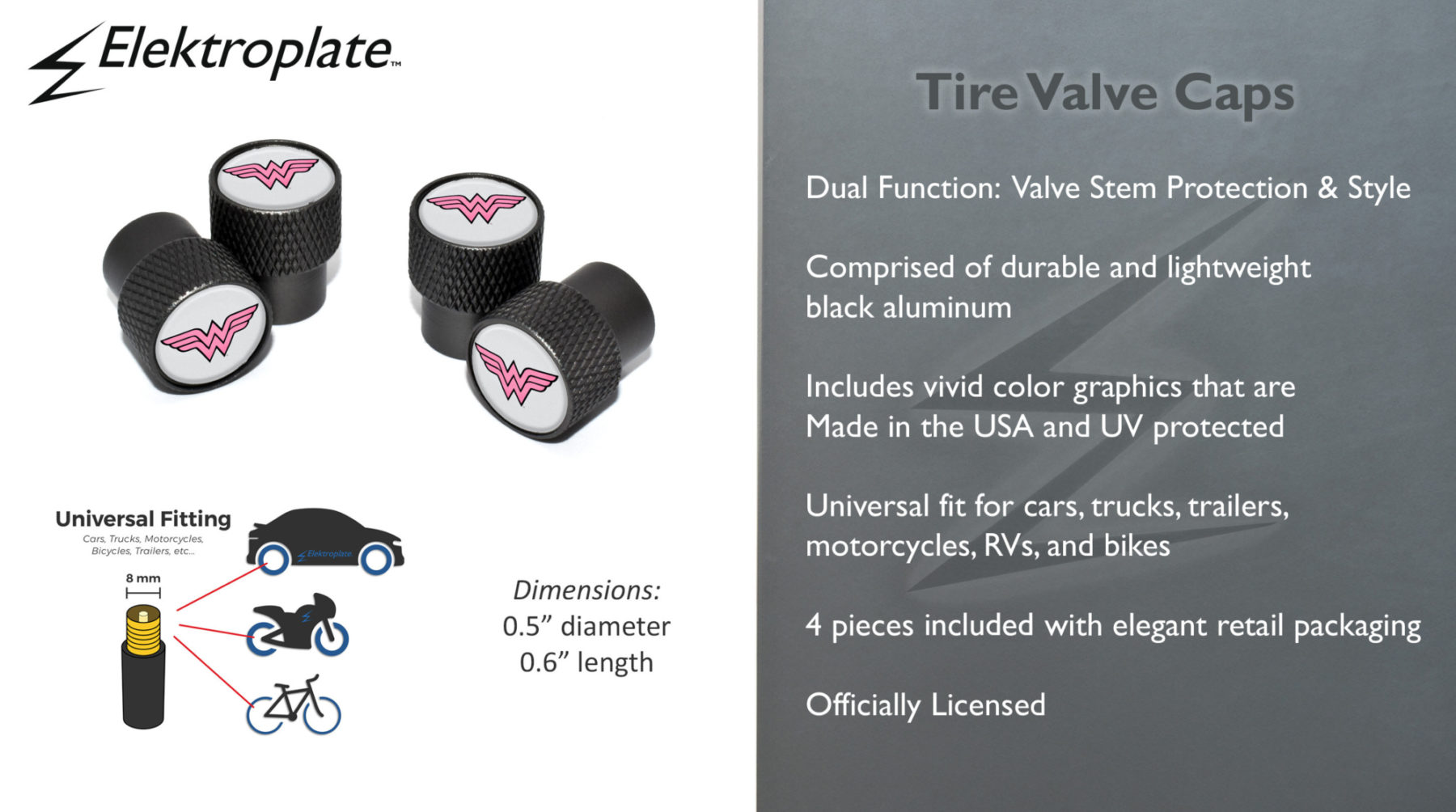 Officially licensed DC Comics Wonder Woman 4-Piece Black Universal Valve Stem Caps by Elektroplate. Featuring UV-protected, scratch-resistant domed graphics made in the USA, these premium valve caps combine durability with a bold black finish. Each cap is made from lightweight, corrosion-resistant aluminum and includes a high-quality leakproof sealing ring to help prevent pressure loss.