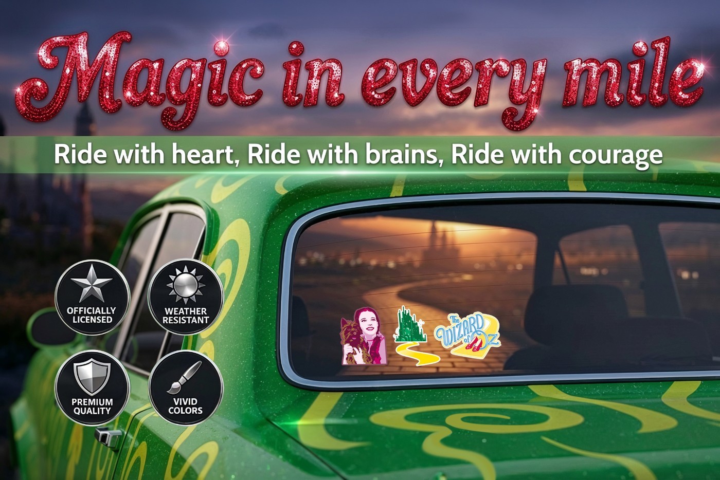 Follow the Yellow Brick Road! Drive to the Emerald City with this Officially Licensed Wizard of Oz decal 3-pack. Proudly made in the USA, our decals are automotive grade, UV-protected, weather resistant full-color graphic stickers designed to last even in outdoor conditions.